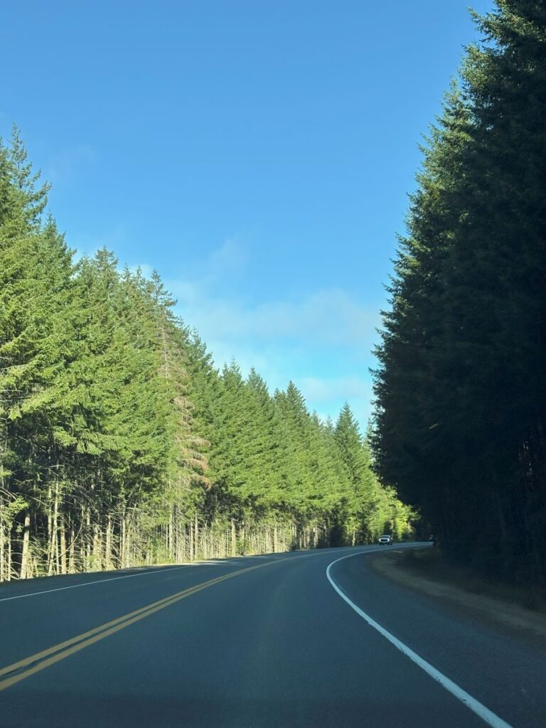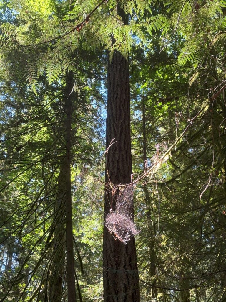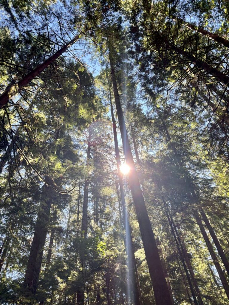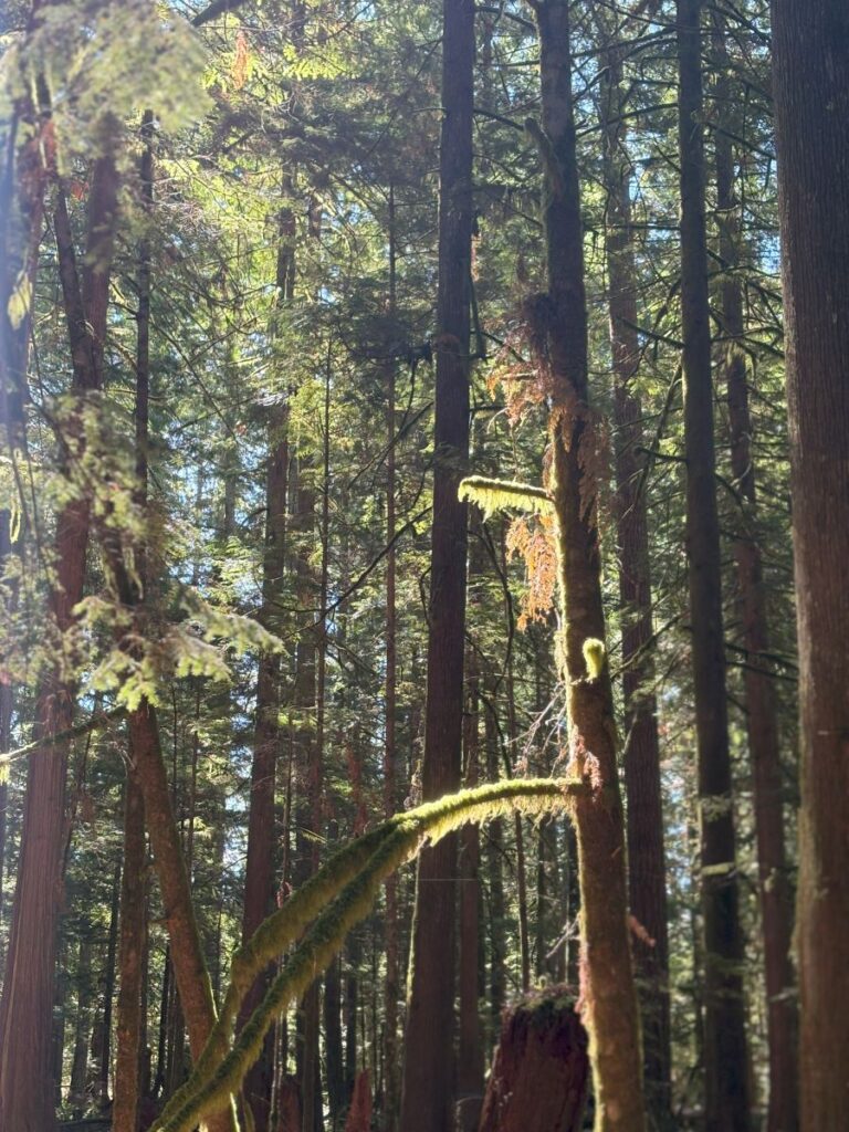 When the sun is shining as it was today, the dappled effect inside this canopy of soaring pine and fir trees is jaw droppingly beautiful. Moss drips from the trees in sheets, swaying in the morning breeze. Nests of spider webs are aglow and dance in the rays.
