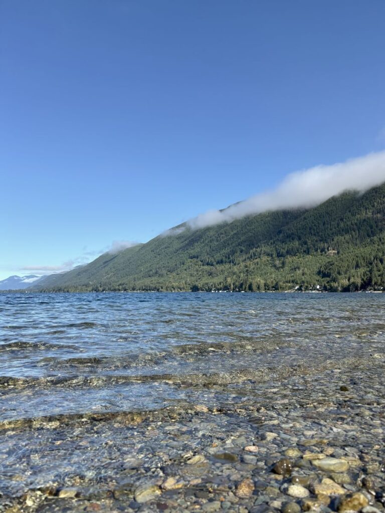 This is what we have actually come for, the beach! A rocky one as are most of the beaches of the lakes and oceans here. The scene couldn’t be more picturesque. With mountains as our backdrop, the light flitters over the surface of the azure blue waters.