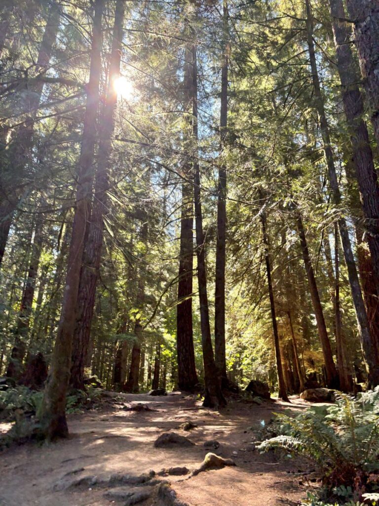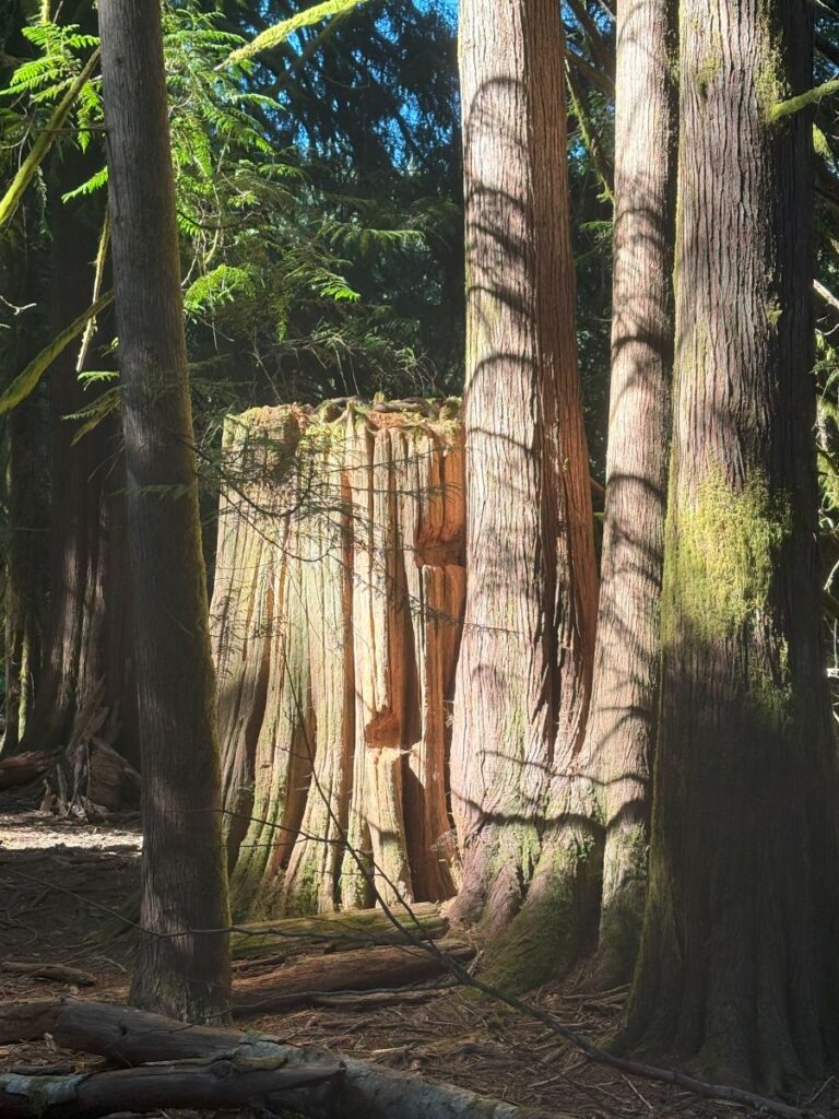 The feeling walking through this ancient forest, seeing the ferns and indigenous salal, is one of surreal beauty. Its magical and makes one feel as insignificant and small as an ant.
