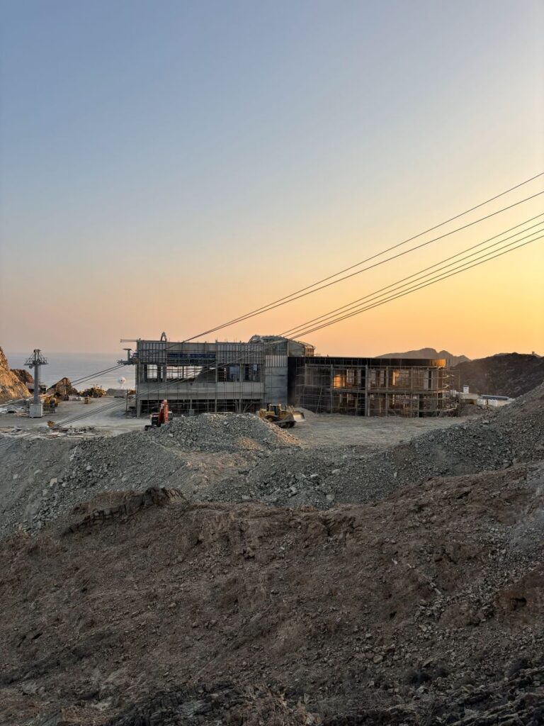 After scrambling up steeper and steeper inclines on the loose rock, we finally reached the artificial plateau created for the cable car base. Here workers were just beginning to arrive for their daily shift. We walked around the area greeting the men, my host asking where the trail was so we could continue on.