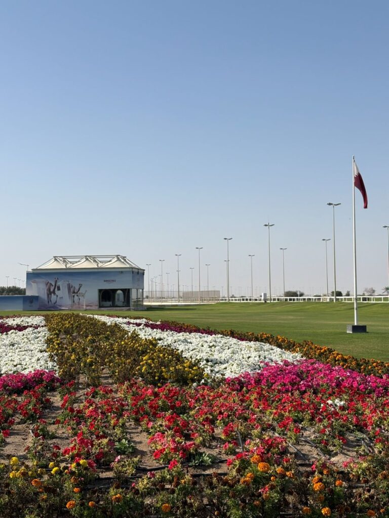 Between the stands and the racetrack is a large green space filled with flowers. There are several jumbotrons on which to view the race as it is progressing. Under one of these a man stands and he offers me a piping hot cup of karak tea, what a treat! There is one single camel standing in a small area beside the grandstand. He is wearing a special coat, so I think he might be a winner for this day.