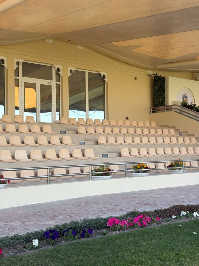 During my afternoon visit I make my way across the street to the manicured grandstand area. This is where the finish line is. The stands are empty, as these races are not the ones that bring in the big money. They are more formalities to determine who is going to race on the big days.