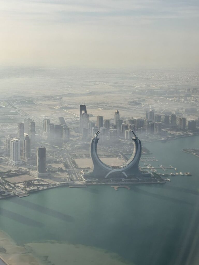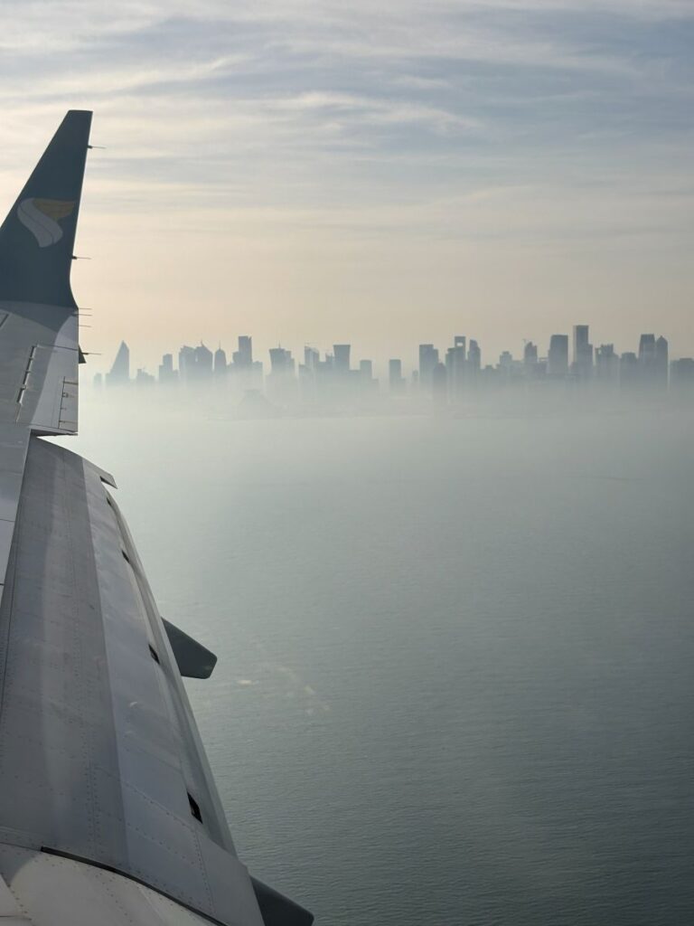 This turns out to be the most fortuitous seat I could have chosen, even if over the wing. As we approach Doha in the late afternoon the lighting is mystical and soft. I spot the coastline and then the beginnings of the city. These come into my view at the rear of the wing, so quite suddenly and by surprise, sliding out from under the white metal canopy.