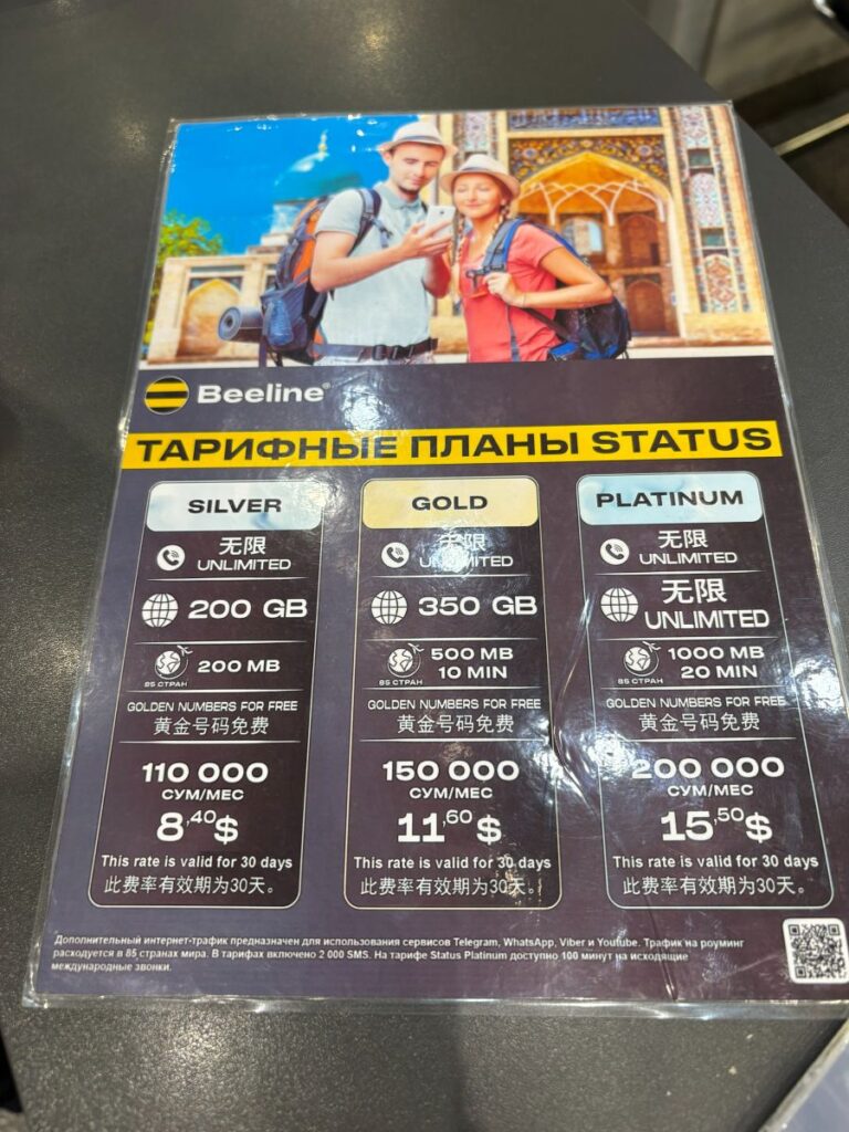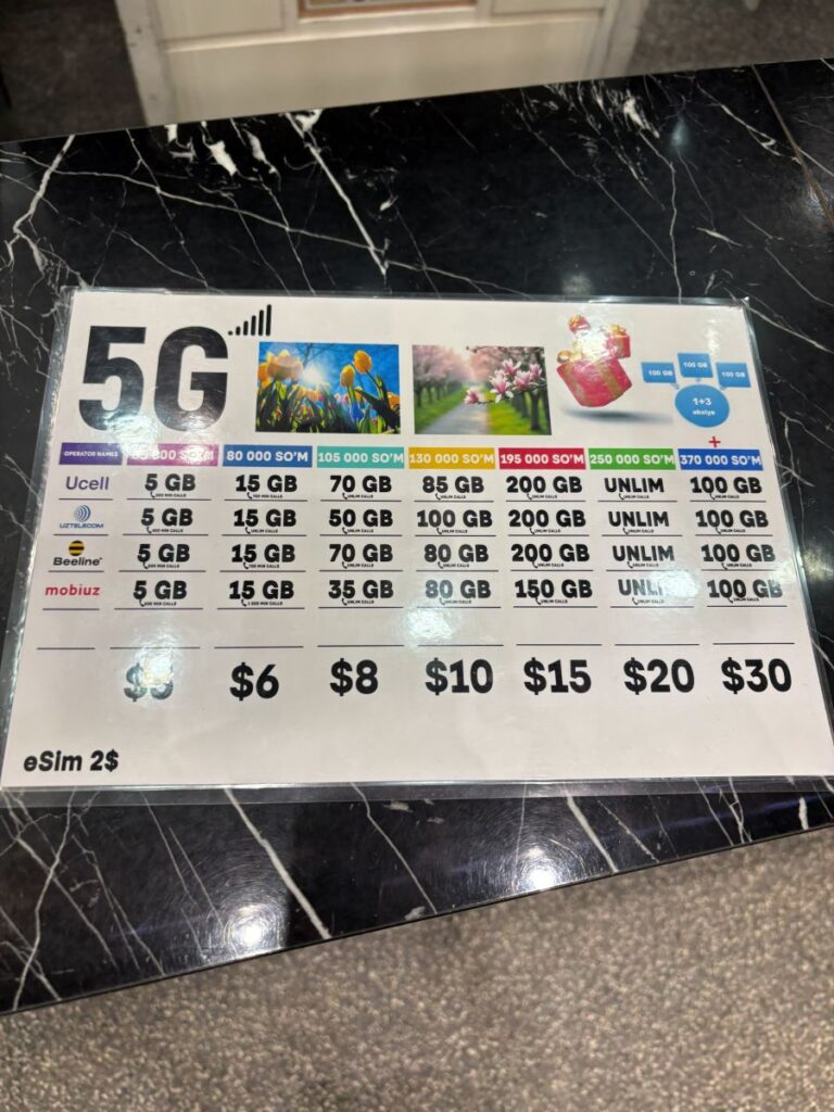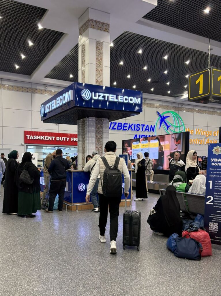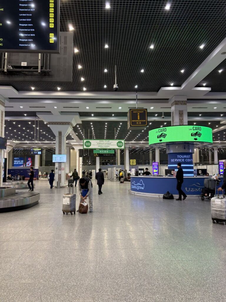 I end up with a card but no calling power and head back to the luggage carrousel. It’s now been over an hour and the bags begin to sprinkle in. Luckily mine arrives, always a relief after losing three now over the years. Back to the SIM card stand and with the help of a man from the information desk, I purchase what I think is international minutes but in fact they do not work. It is decided amongst all people involved with this purchase, that there is no way for me to make an international phone call using an Uzbek SIM card. 🤯