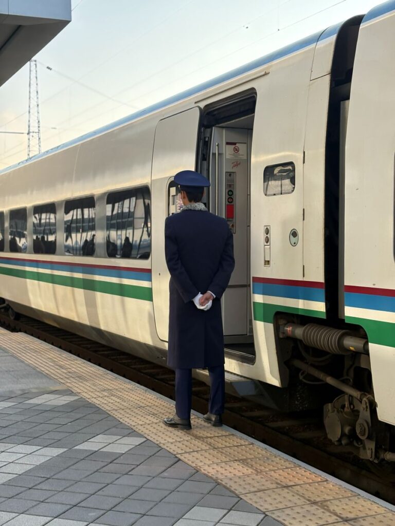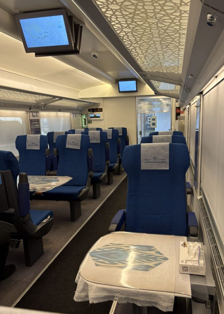 Then you are allowed through the gates and outside. I am taking the Uzbek high speed train this morning called Afrosiyob. When I booked, I selected business class as the price was only $13 more, economy for $25 CAD and business for $38 CAD. My gorgeous train pulls in and the uniformed guards are waiting to let me into my assigned car and seat.