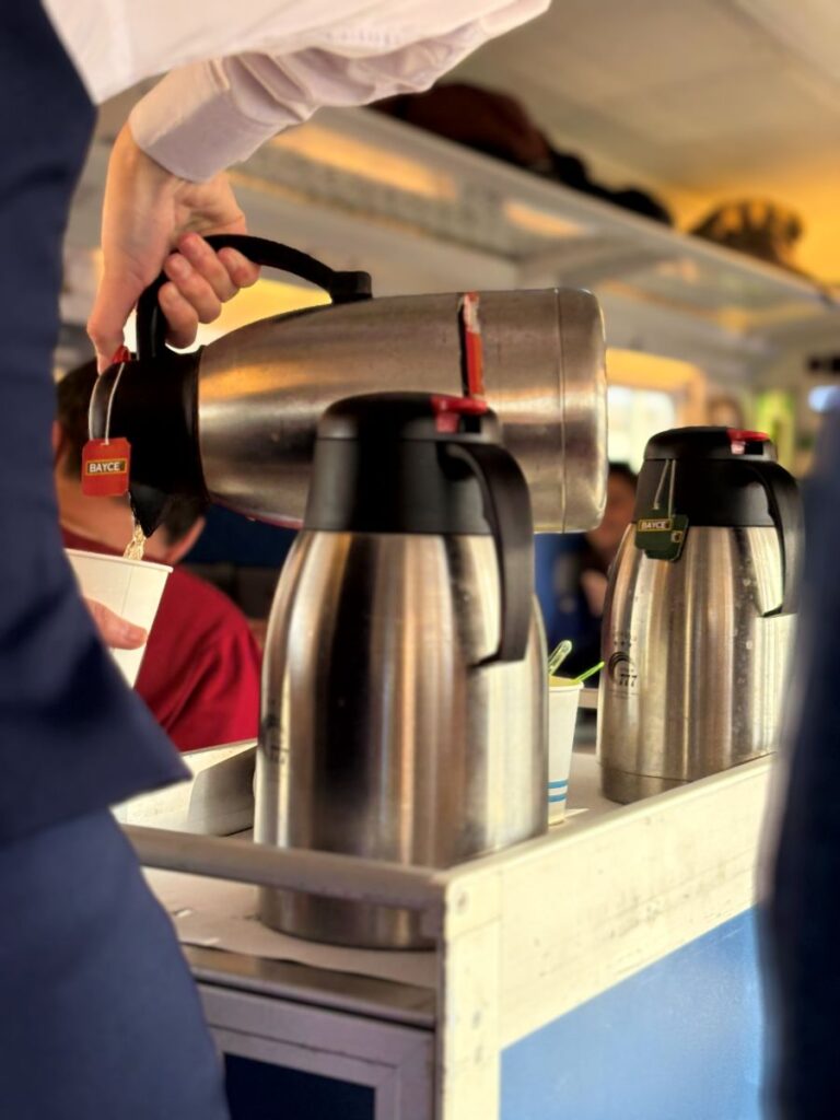 The train is absolutely charming, big comfy seats, some with little tables and even lacy tablecloths and boxes of tissues. After the train departs on time, we are offered a small bagged breakfast and coffee or tea.