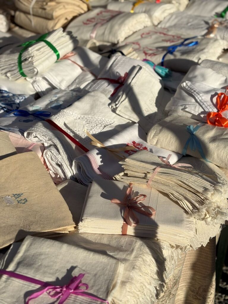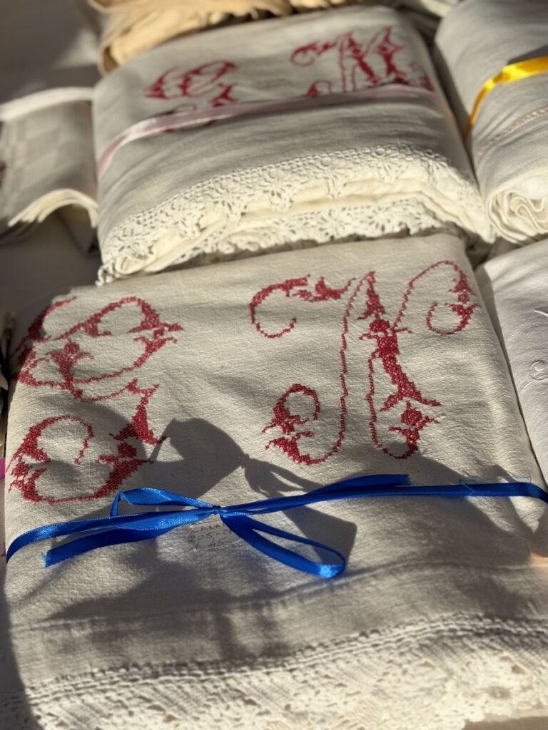 If you are a lover of any type of vintage linen, this is your dream destination. Tables and tables of gorgeous crisp white bed sheets and tablecloths. So many antique hand towels, napkins and household pieces. One vendor had an entire area devoted to monogrammed items. How lovely to take home a set of linen sheets with your initials embroidered onto them.