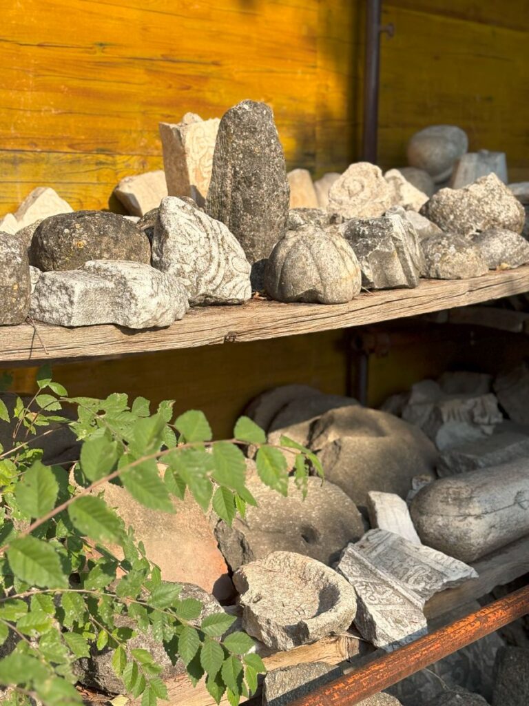 There is no museum here, unfortunately those plans were cut short. There are however, a pile of stone artifacts over near the entrance. Duck into the garden area, under a large tree. There may be some vehicles parked here. Behind them, is a wooden structure, in front of which is exposed shelving.
