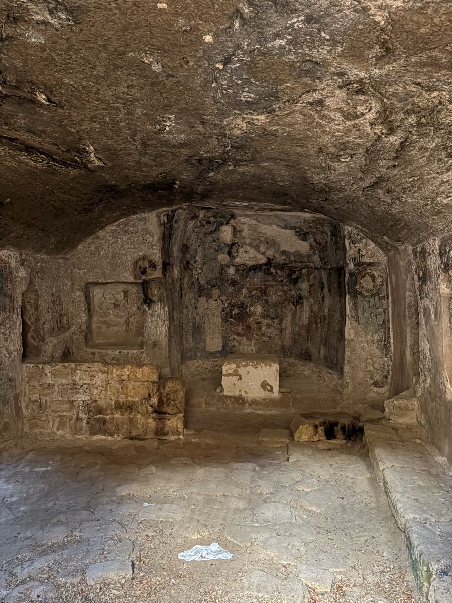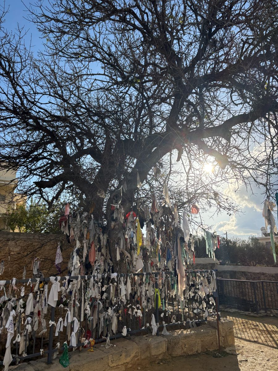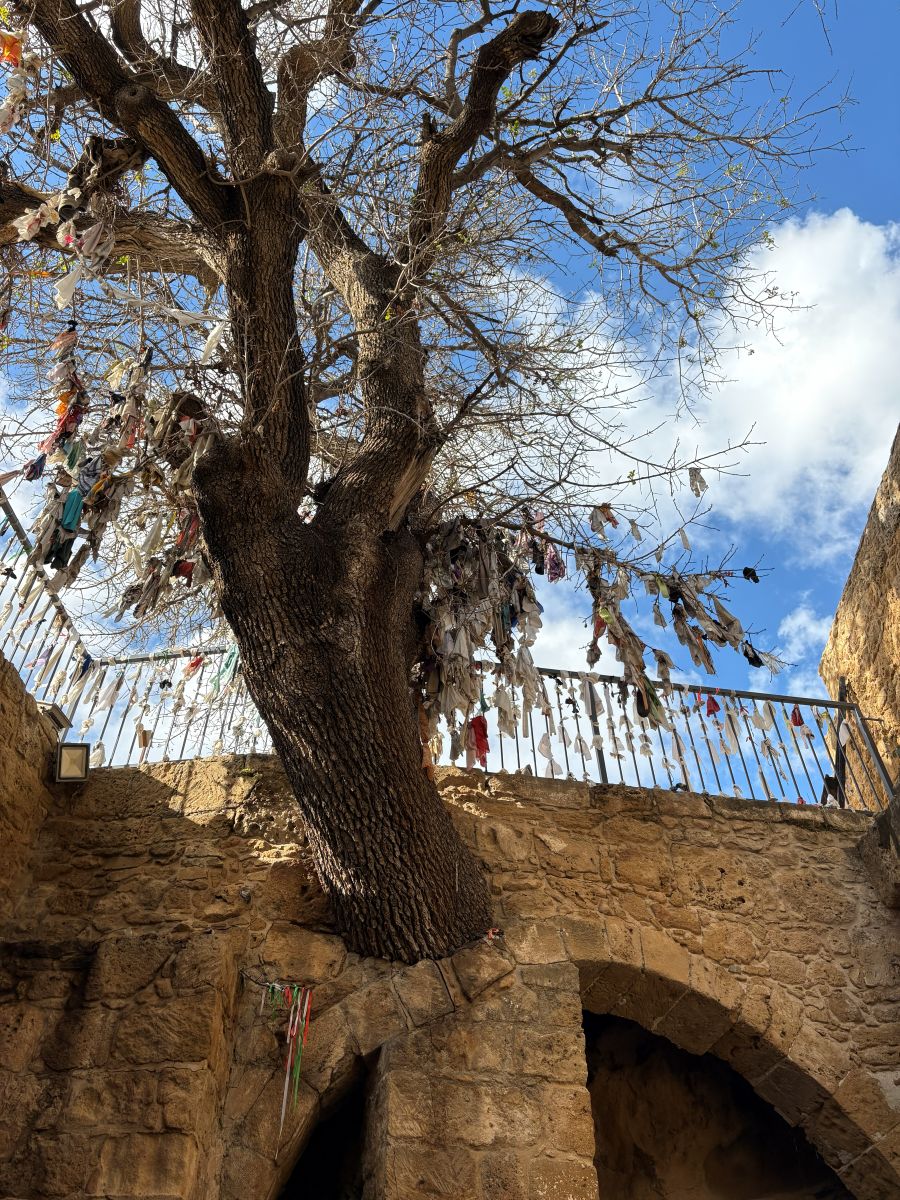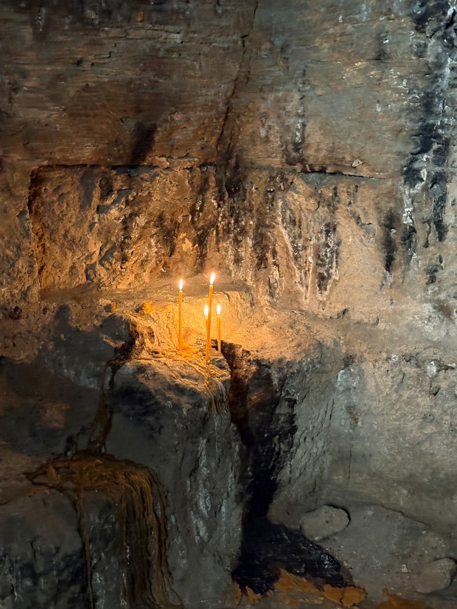 Today the caves have been transformed into an underground place of worship. Shading from overhead is a 600-year-old pistachio tree that is said to have healing powers. Since the Middle Ages, people have come to hang pieces of cloth from its branches and leave their secrets and prayers.