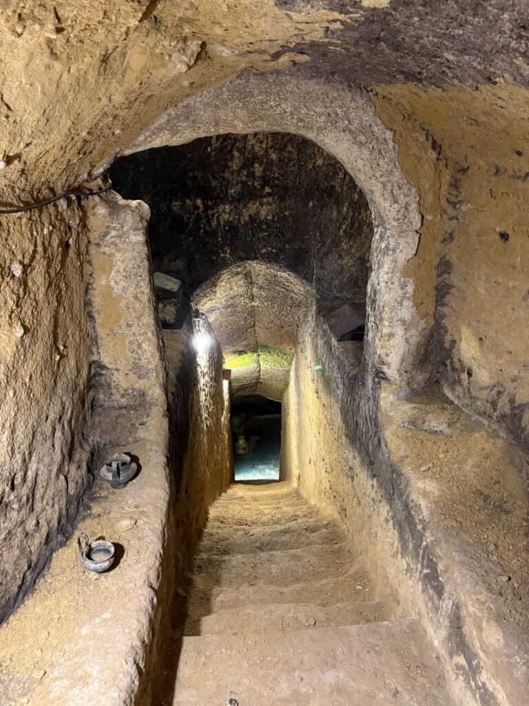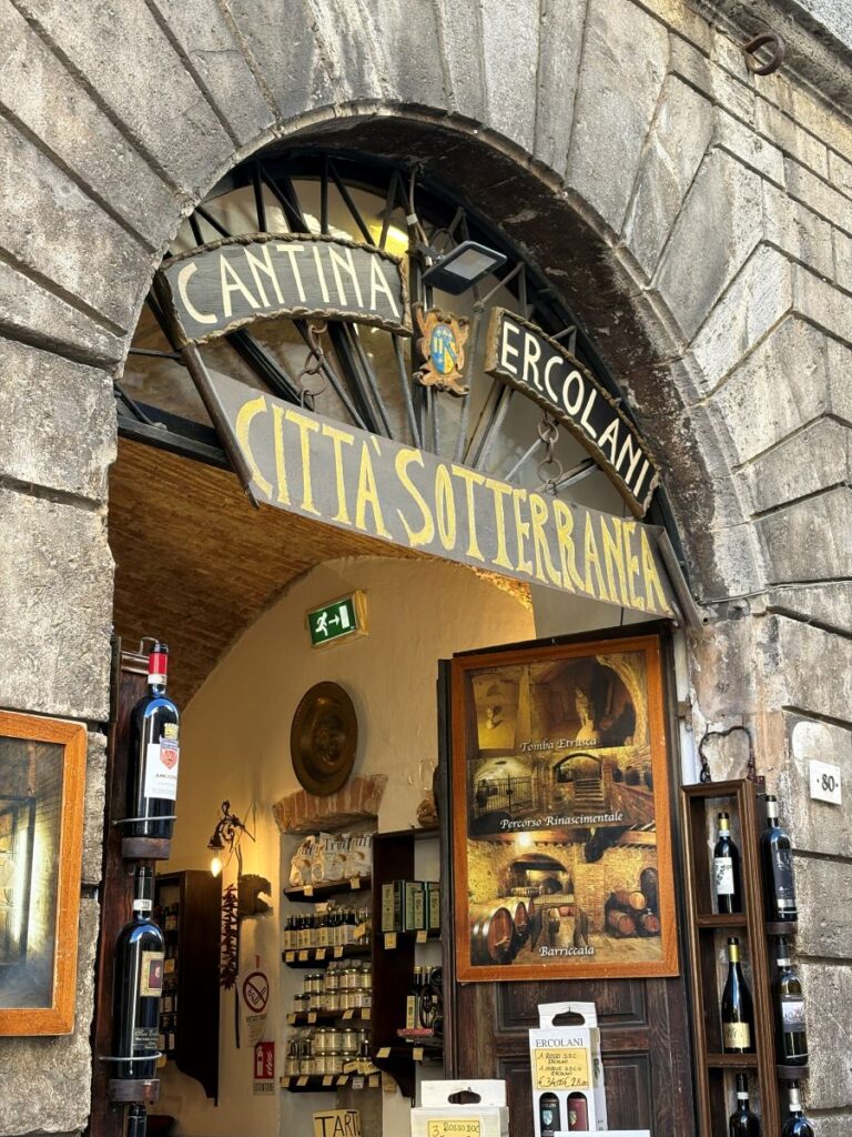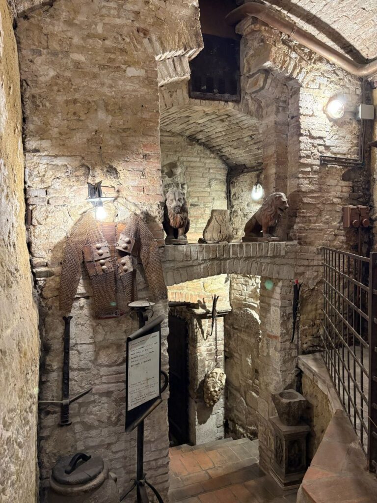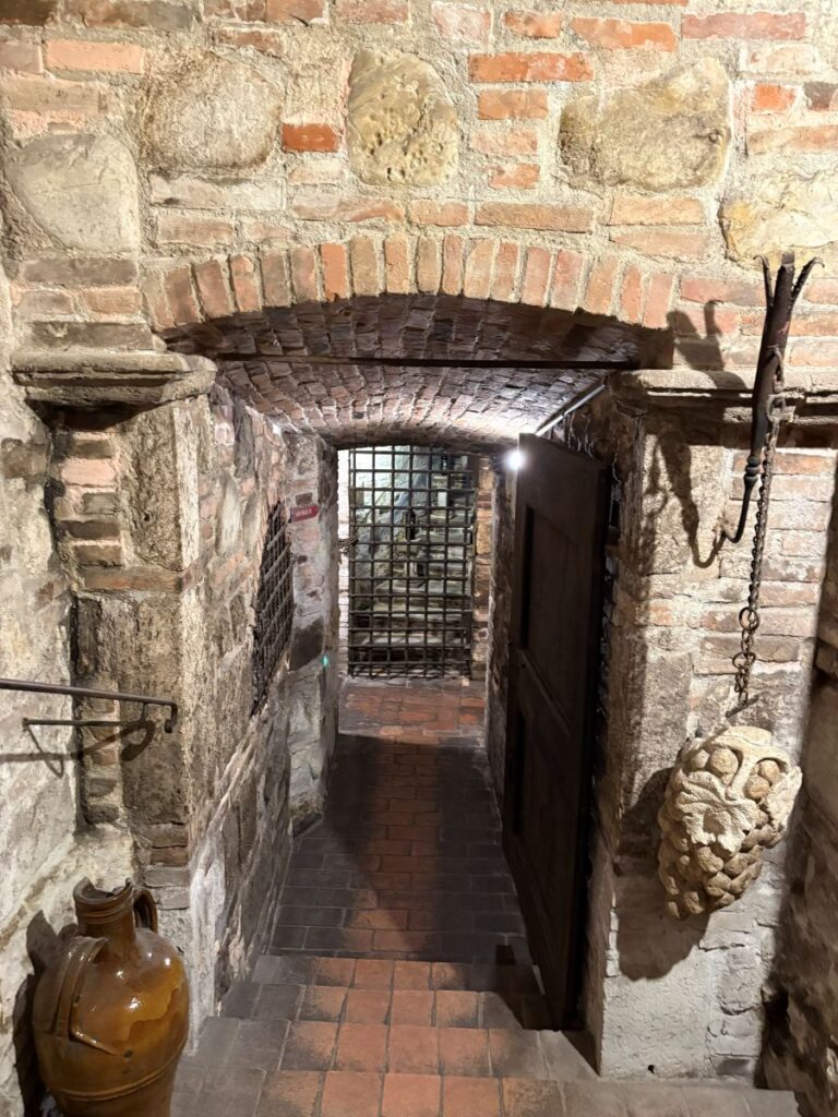 This set of cellars is massive and deep. Parts formed the old medieval walls of the city, before the palaces above were constructed. Visitors will find deep wells for collecting rain water and holding fresh water. Today these are filled with coins and money dropped by tourists making a wish. The deepest tunnels lead to the Etruscan tombs and visitors are not able to descend to those depths for liability purposes.