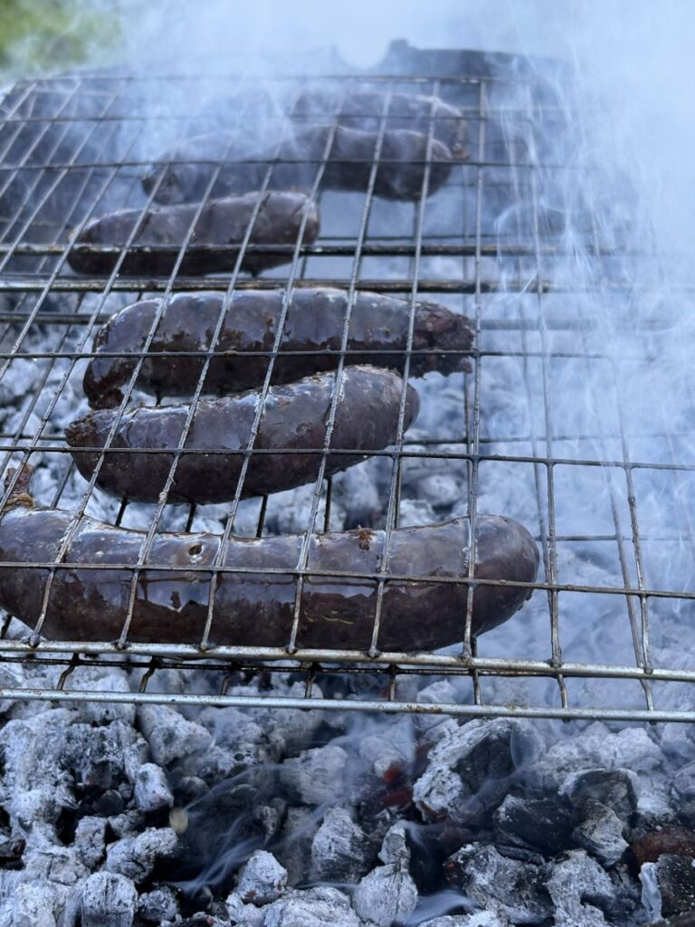 Each one is monitored carefully, for they must not be burned by flame, but rather cook by the heat of the coals. As soon as the fat begins to drip, the flame shoots up and the screen must be lifted and turned. Before long the surface of the lamb has a caramel coloured glaze bubbling with temptation and smell. We have also been cooking sausage too, ones from a local who has soaked them in red wine! How marvellous.