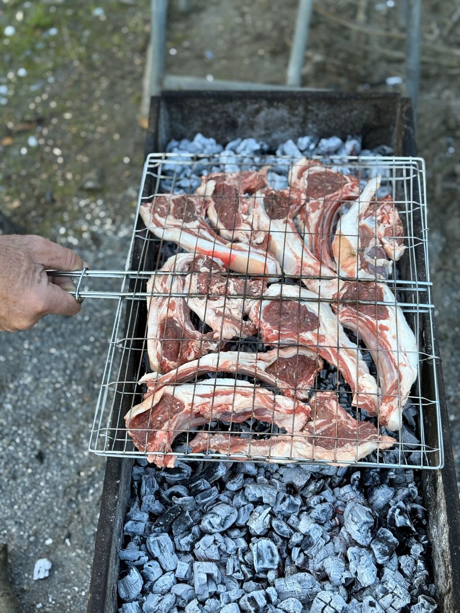The night before my departure is the crème de la crème. A lamb barbecue!! Out back, behind the house and under the orange trees, the farmer has lit two BBQ’s with olive branches he has collected last year. Once these have burnt down and turned into coals, they are broken up and the fun begins. Out from the kitchen arrive mesh screens full of fat lamb chops. The farmer sits between the two BBQ’s and begins the dance of the lamb.