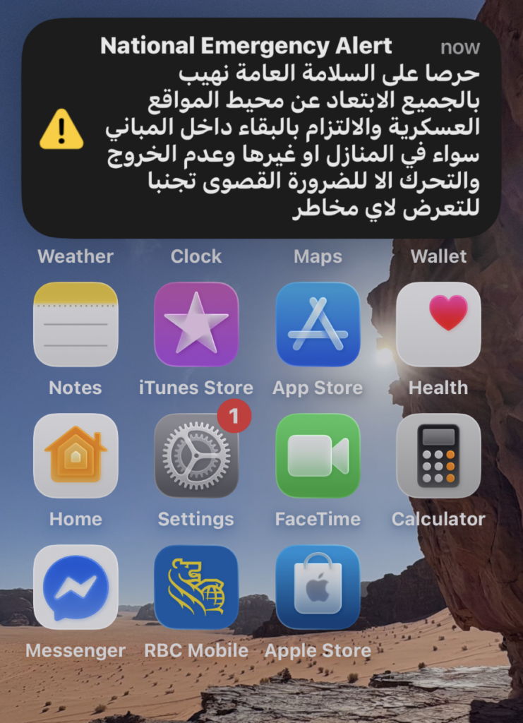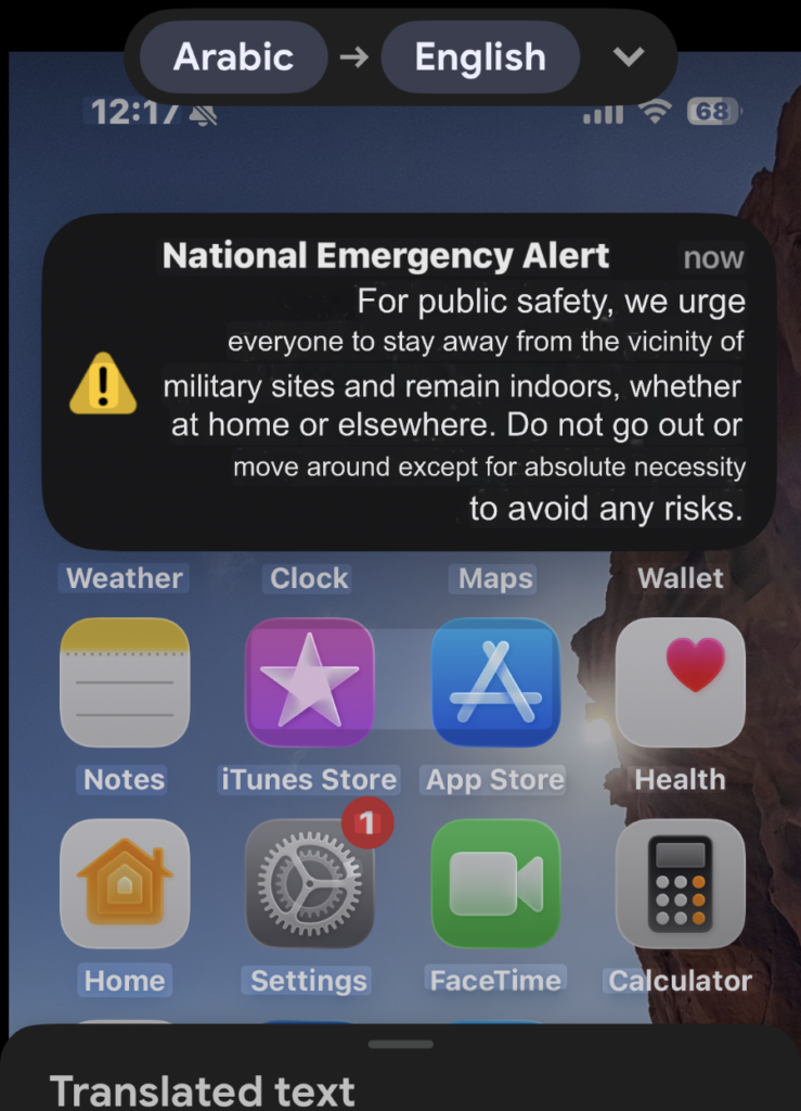 At 12:17 a message landed on my phone screen, in Arabic, accompanied by the almost universally recognized screeching noise. Not knowing what it said, I quickly took a screen shot and looked it up using Google Translate. Not two minutes later another came through.