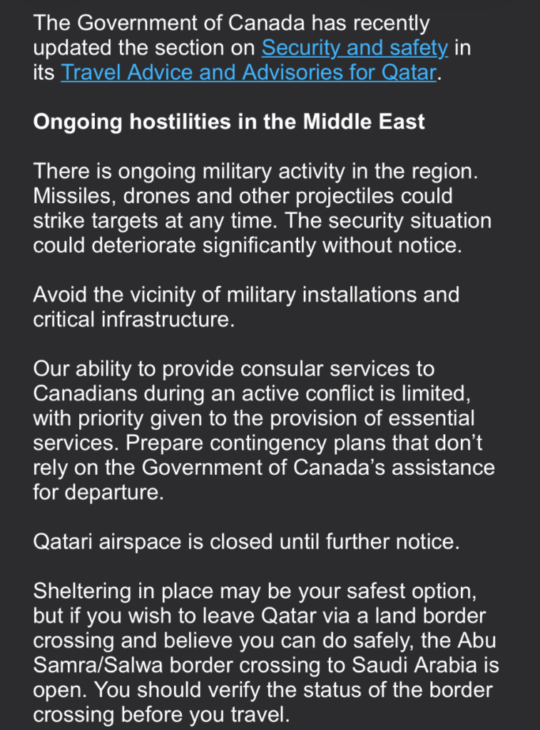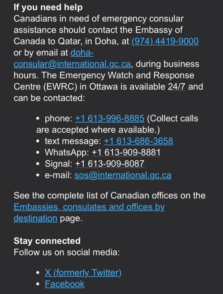 And finally, something comes across my socials feed from the Canadian Gov! Not via email but by chance I see this. It provides an email address that I can message to ask for assistance to get out! Of course, I fire off said email right away and have a feeling of hope that there is at least another avenue that might open up for me.