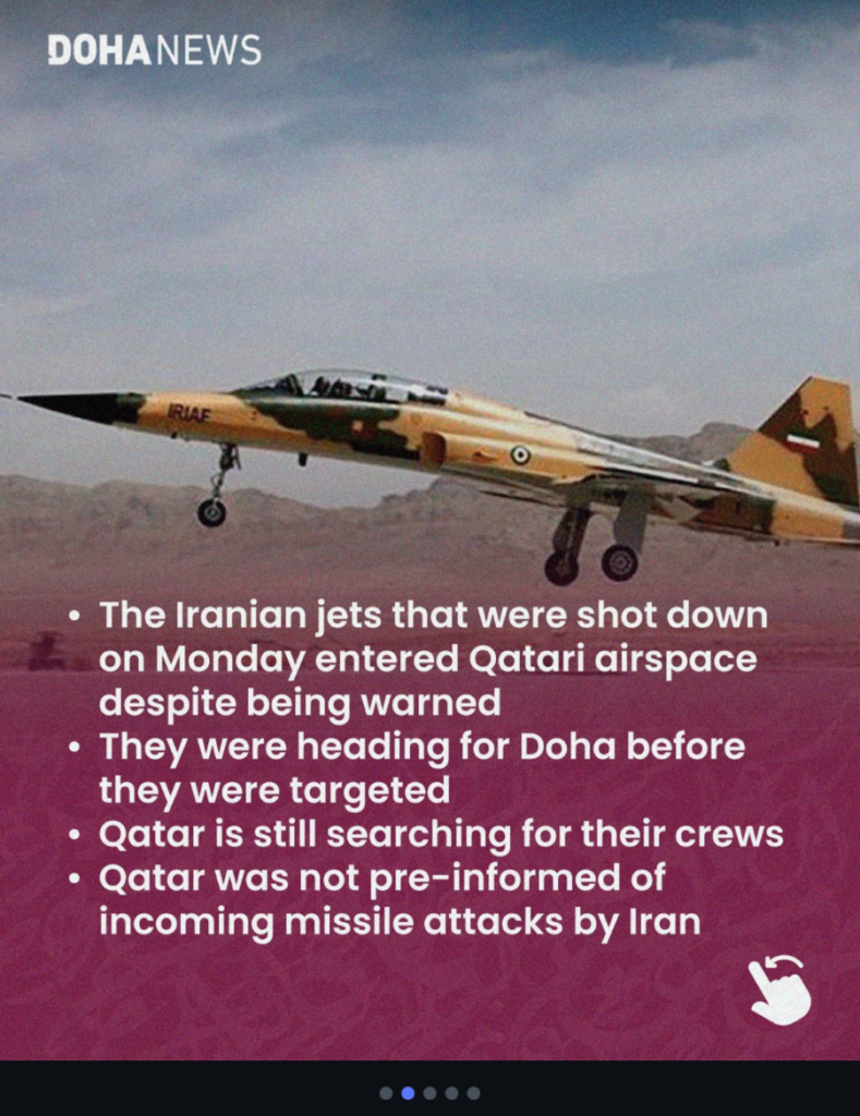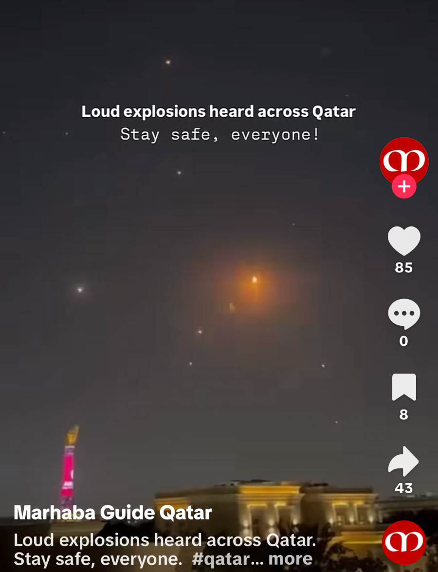 Mid morning and the loudest booms yet ring out across the city. I am terrified and searching for any news. Turns out the Qatari fighter jets have shot down two Iranian jets near the city.