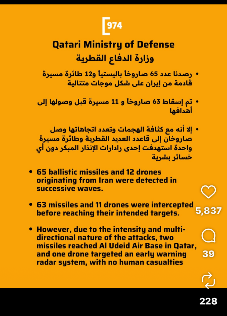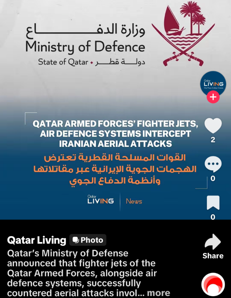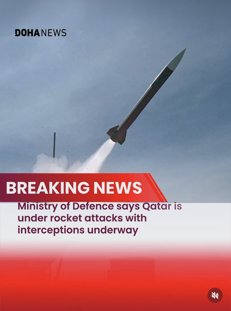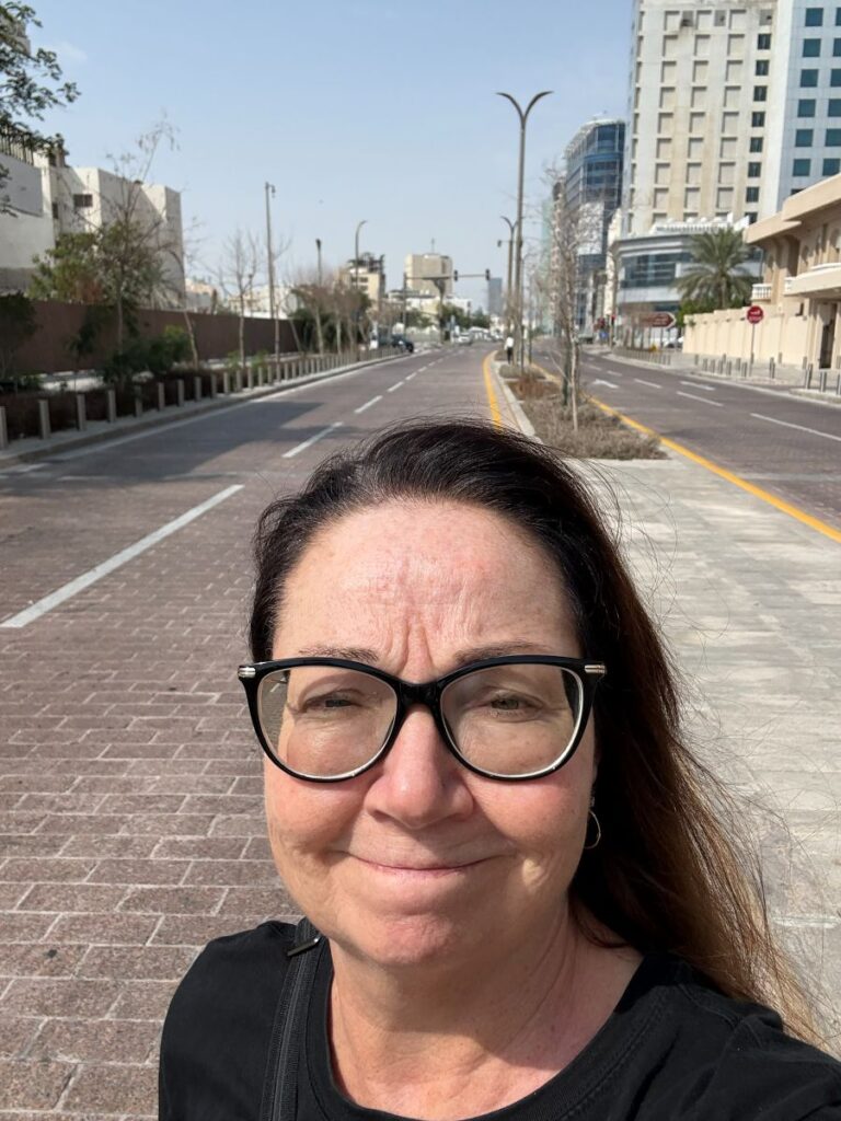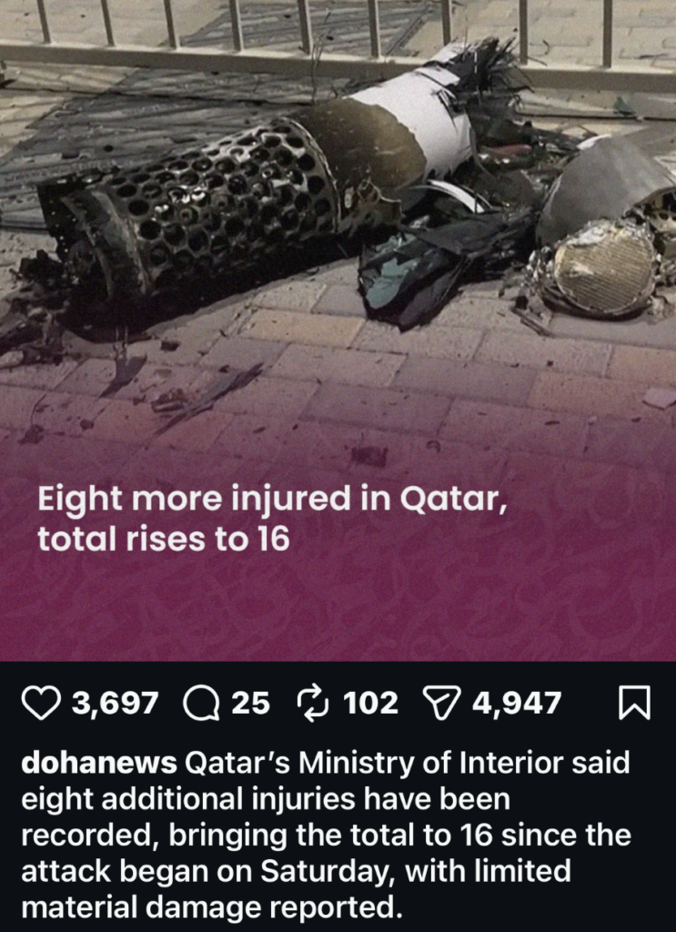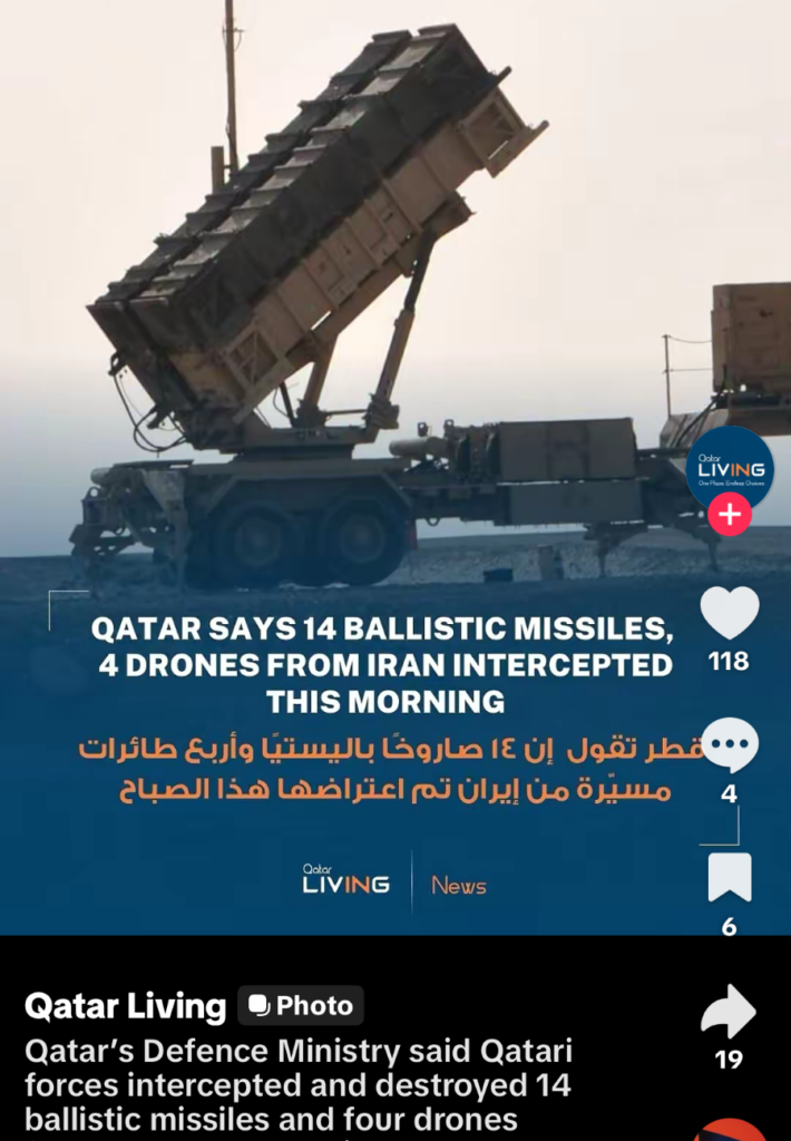 I had just been out for a long walk, mailed my postcards, picked up some groceries and was on my way back to the hotel. I no sooner arrived and began to hear what I thought were bombs. This is what began to cross my social media by 15:12 that day. And at 23:35 I was still hearing ‘bombs’ and have audio recordings standing at my open hotel window. I now know these were incoming ballistic and other missiles being intercepted over the city of Doha.