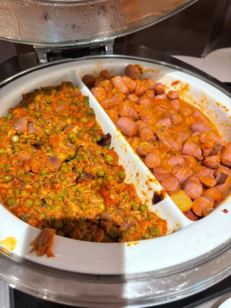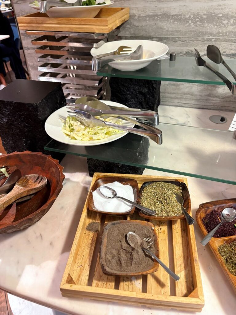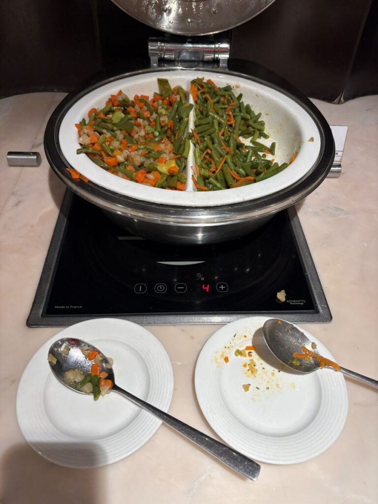 The day I had been hoping beyond hope for the Doha airport to be open, and it is not. I head down to the hotel front desk and checkout and check back in for the start of my extended stay. I am allowed to begin eating at the hotel restaurant as of lunch time. I head down at 12:30 and this is the meal of the day at the buffet.