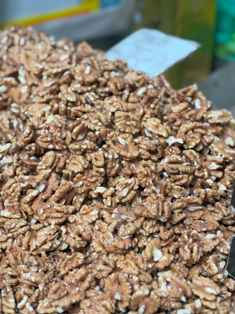 Beautiful almonds, loads of fresh raw walnuts, and peanuts! More peanuts than I’m used to seeing in fact, and coated with different flavourings. Don’t let me forget the honey, its golden colour lighting up the stalls like lanterns.